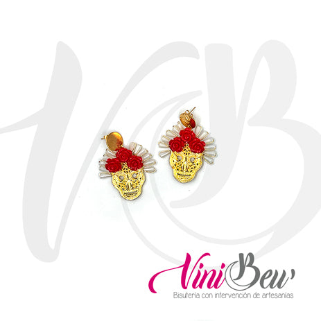 Este divino diseño simula una tehuana con resplandor formada por unas calaveras de chapa de oro, piedras y flores de resina.