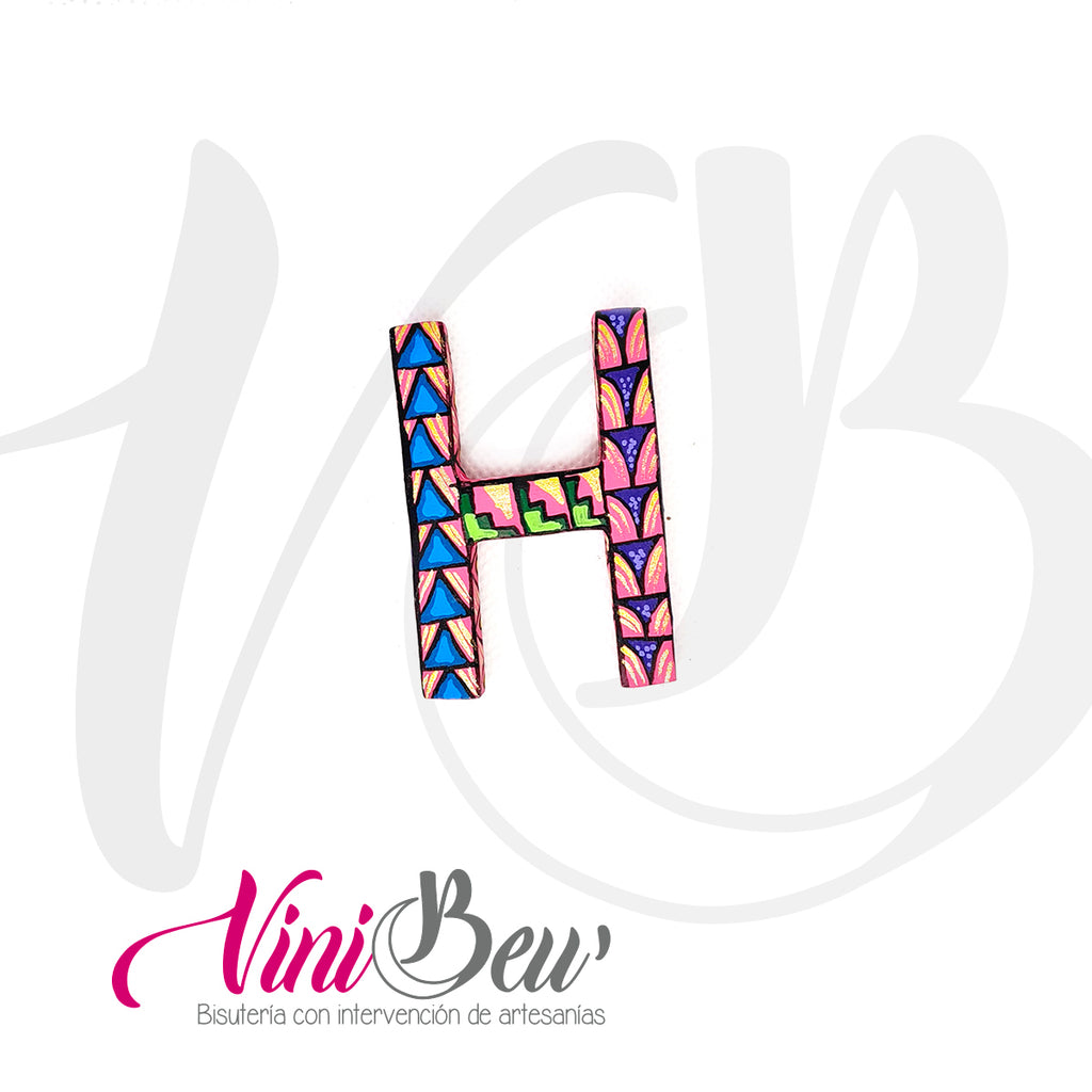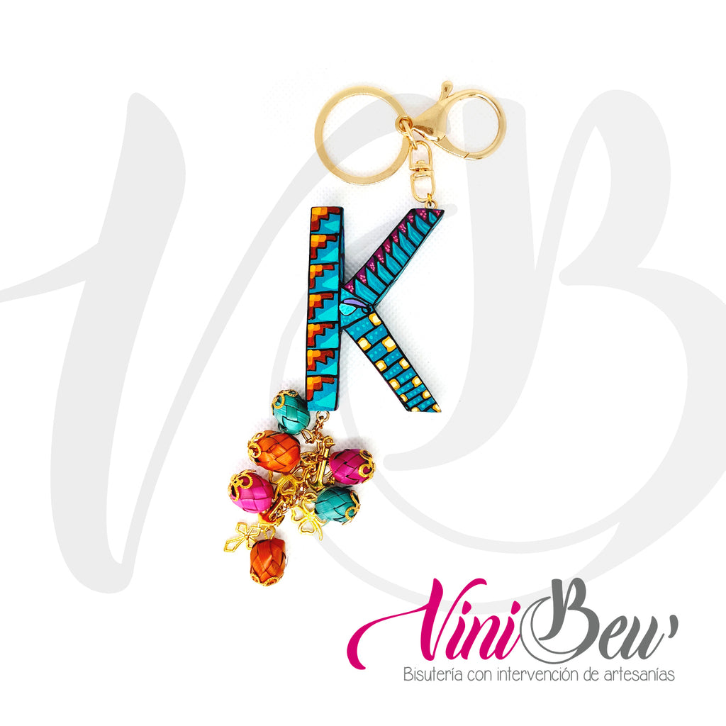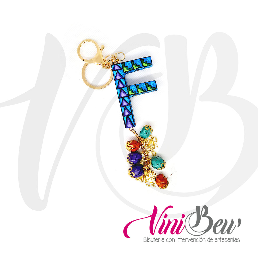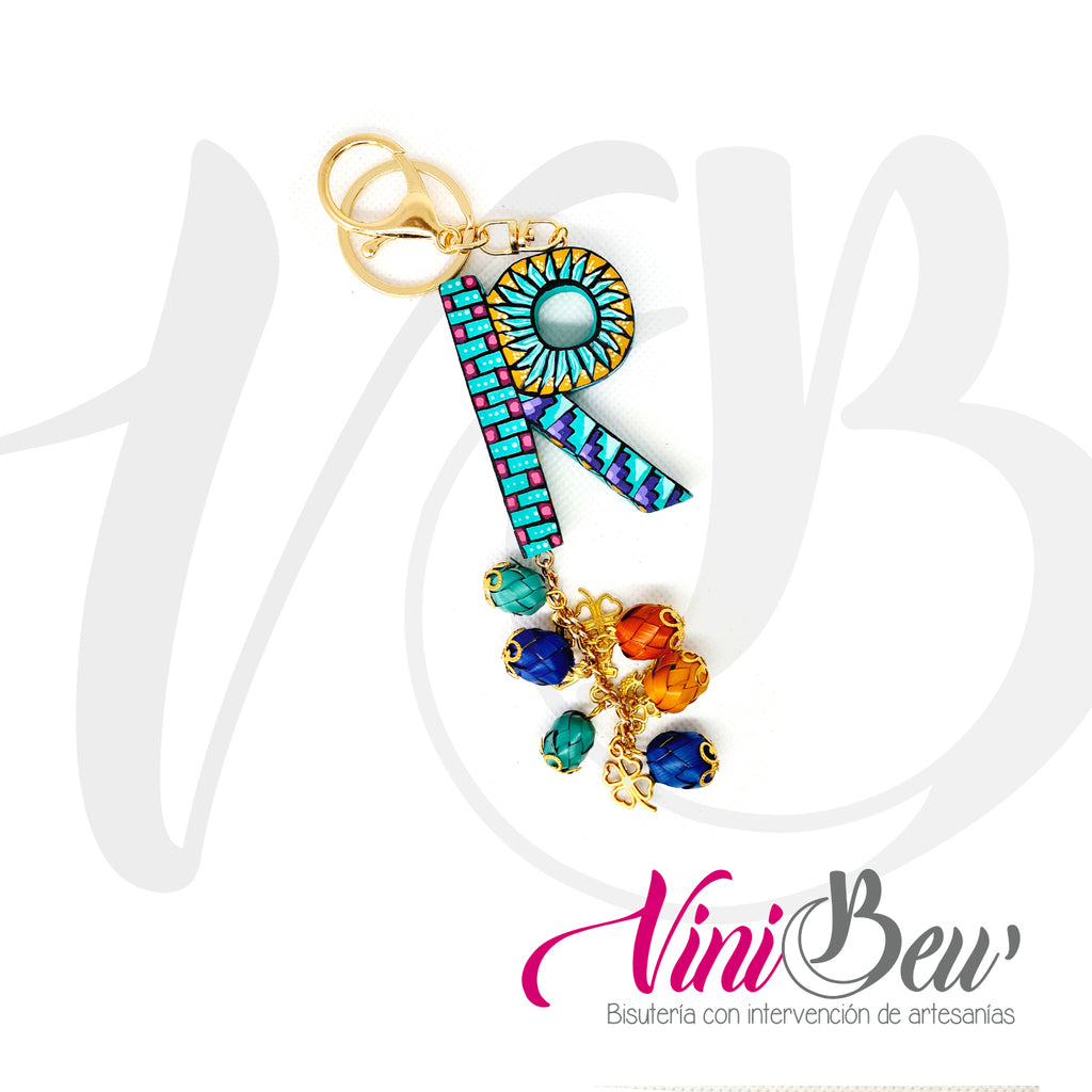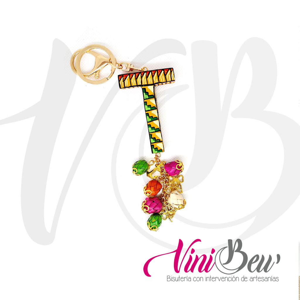 Moderno y exclusivo llavero con una letra de madera de copal tipo alebrije. Su diseño se complementa con un racimo de petatios de colores y dijes de pewter.