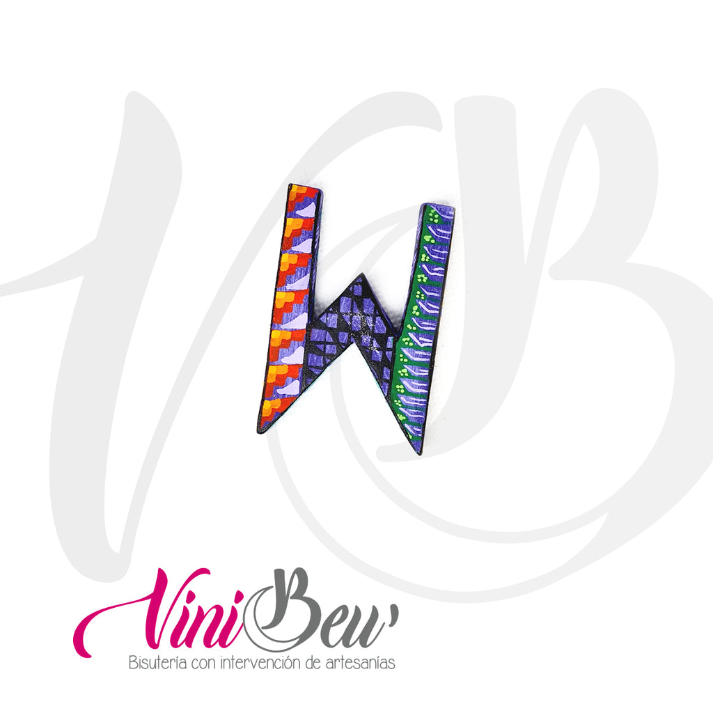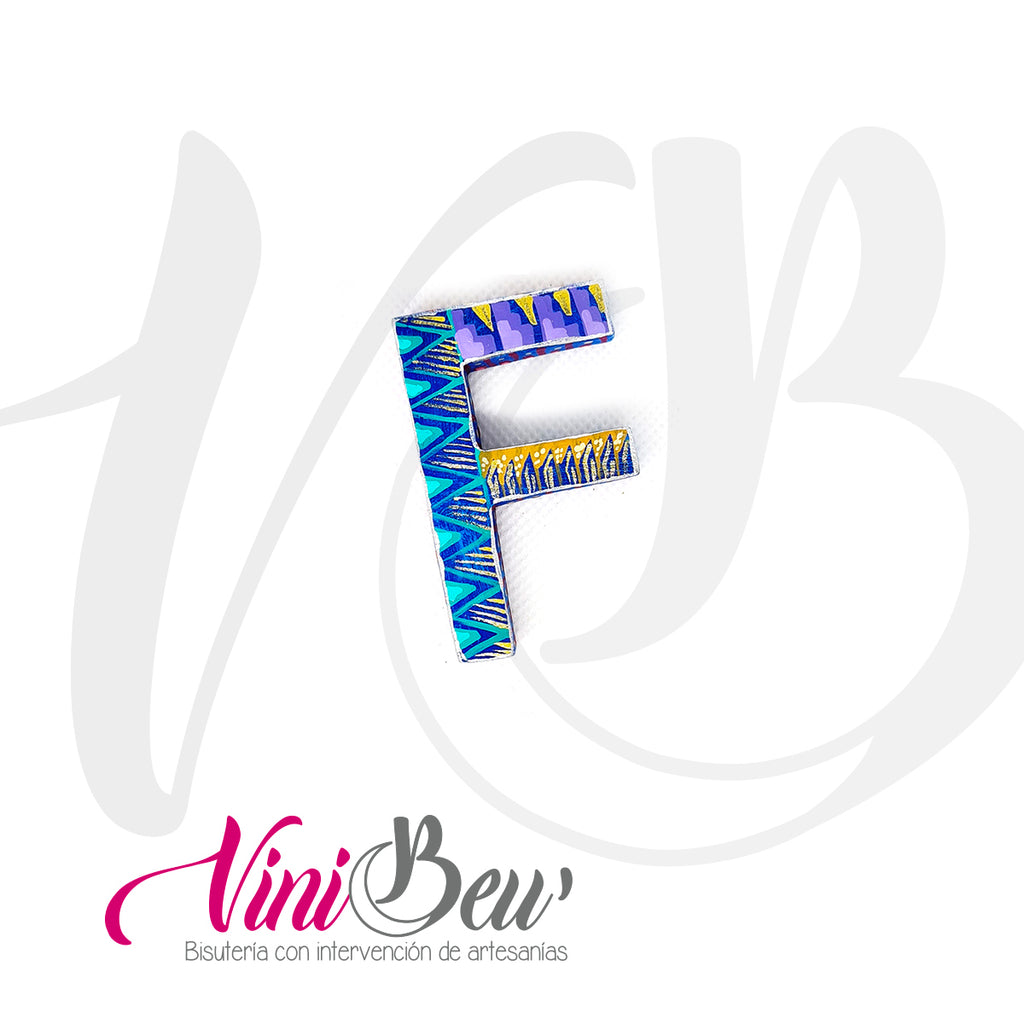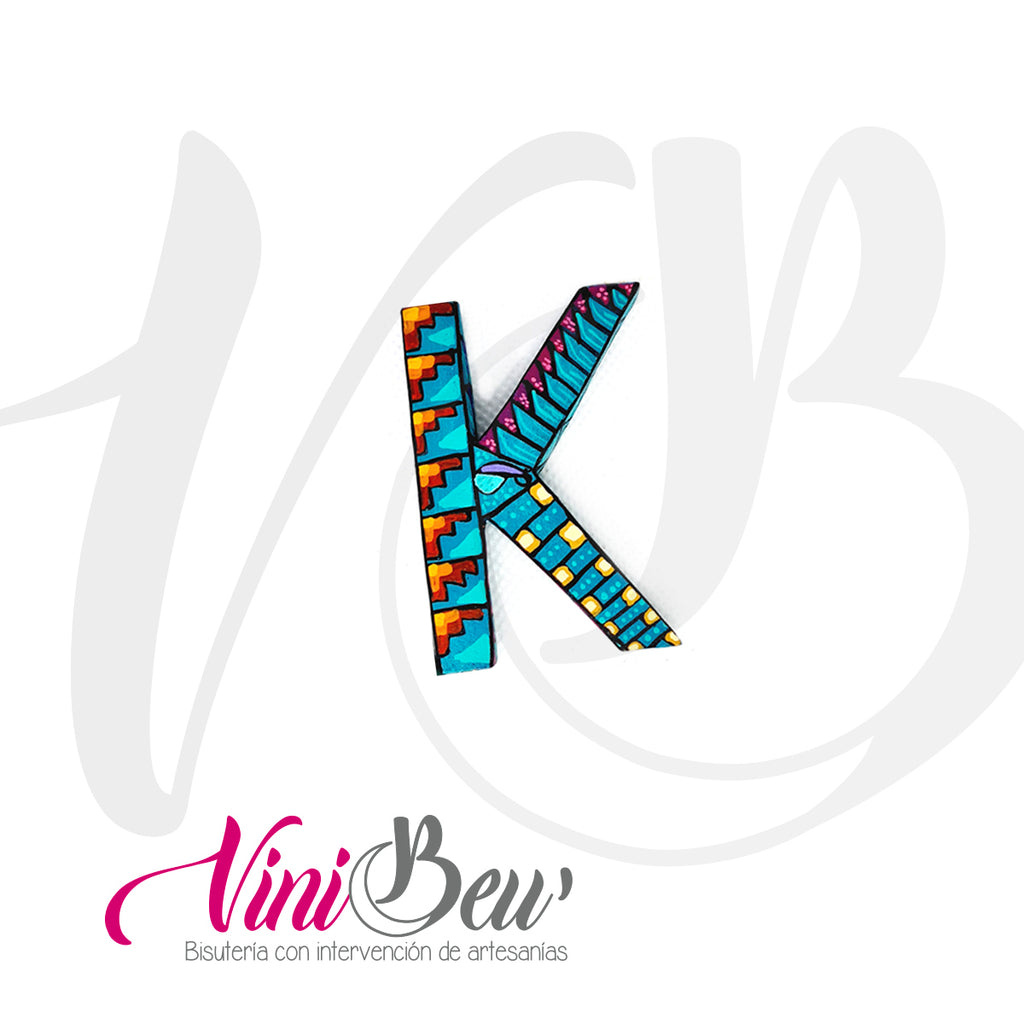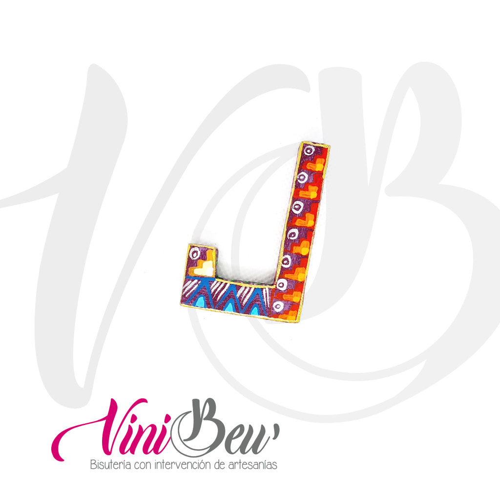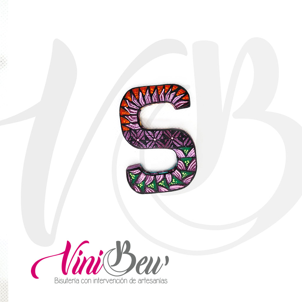 Moderno y exclusivo llavero con una letra de madera de copal tipo alebrije. Su diseño se complementa con un racimo de petatios de colores y dijes de pewter.