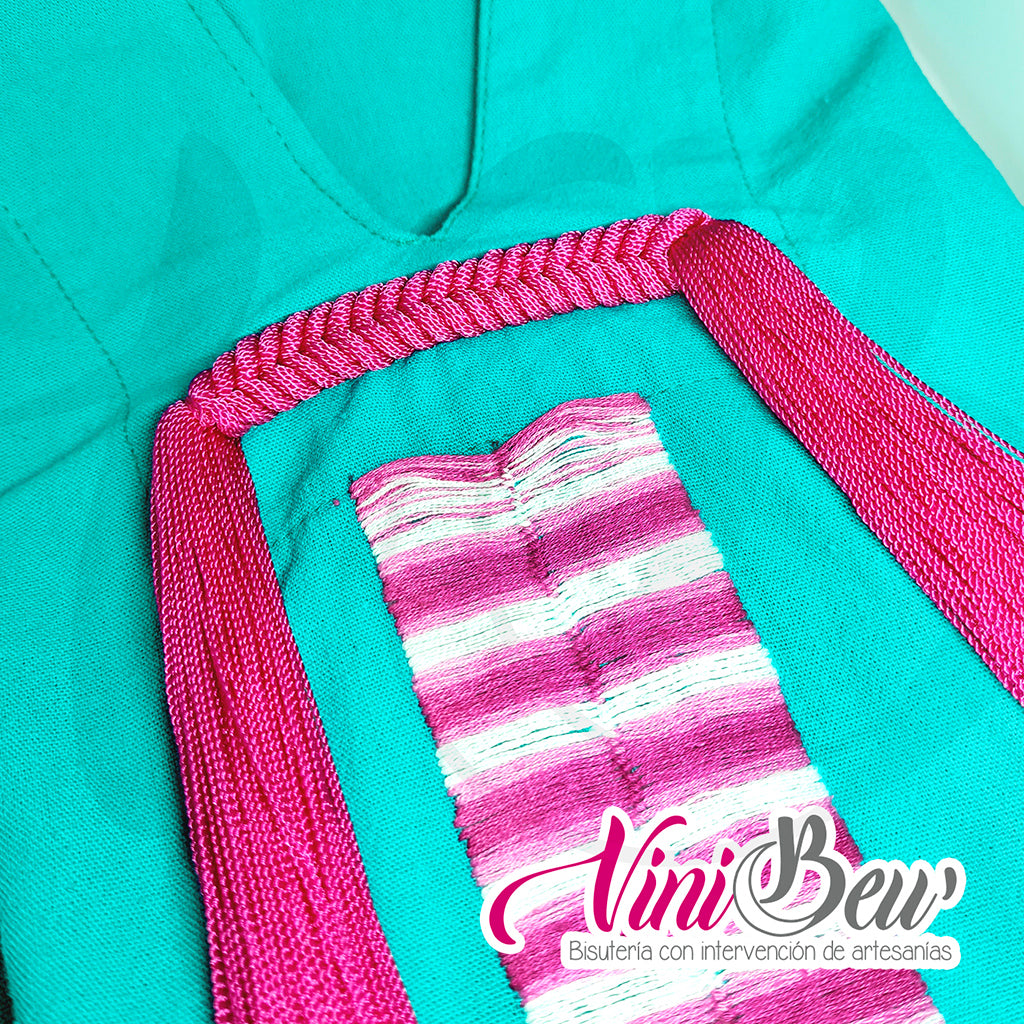 Este moderno y creativo collar, está elaborado tomando una trenza de la vestimenta de Yalalag y convirtiéndola en una motita larga y original que le dará un complemento a tu oufit. Su diseño se complementa con un medallón de corazón con cristales.